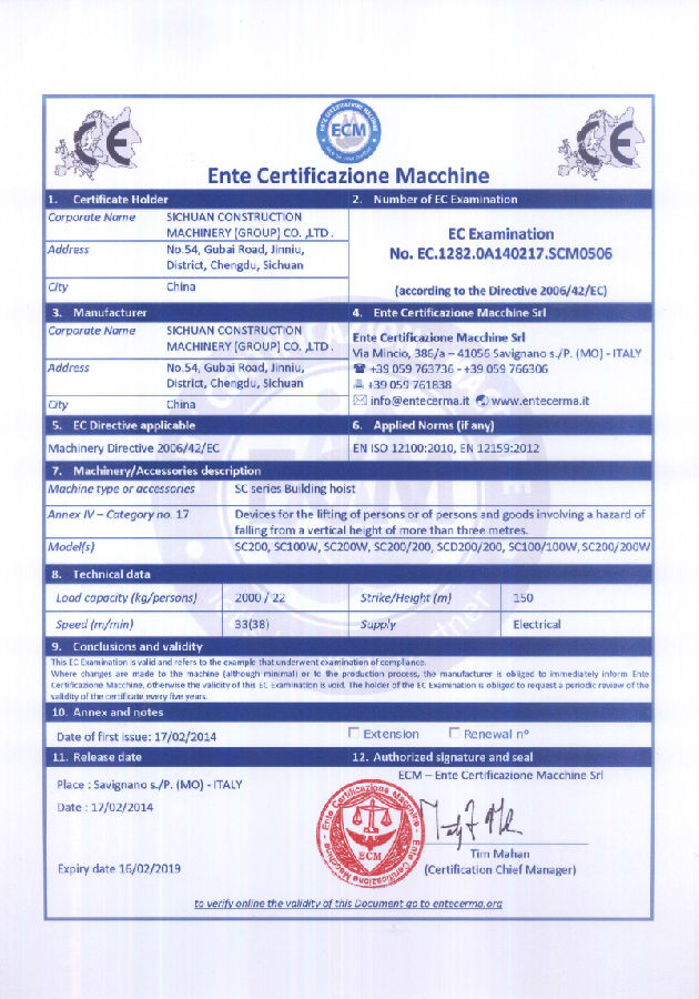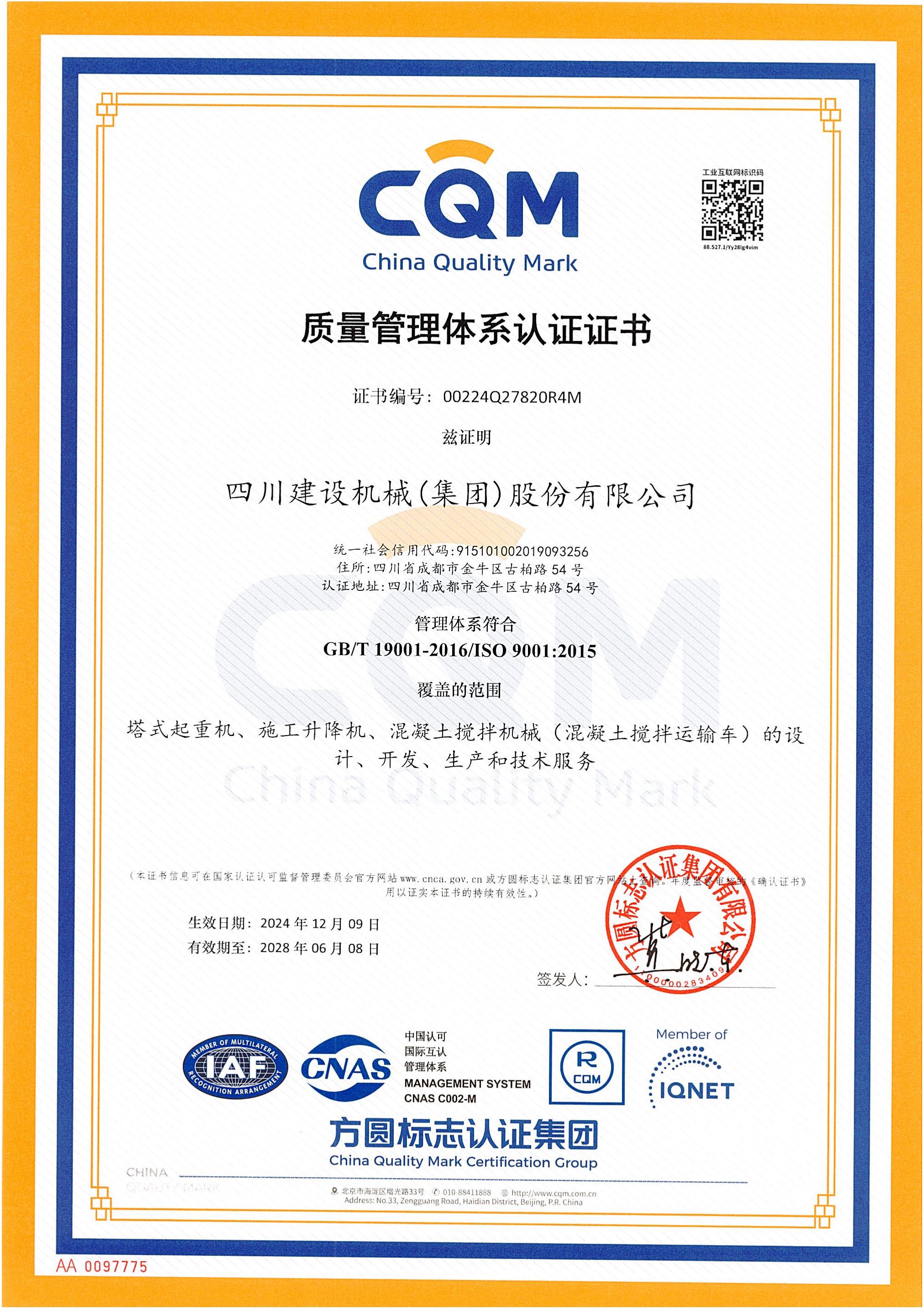 顺利通过ISO9001国际质量体系认证,体系覆盖产品:塔机、施工梯、混凝土搅拌机、胶印机系列产品;