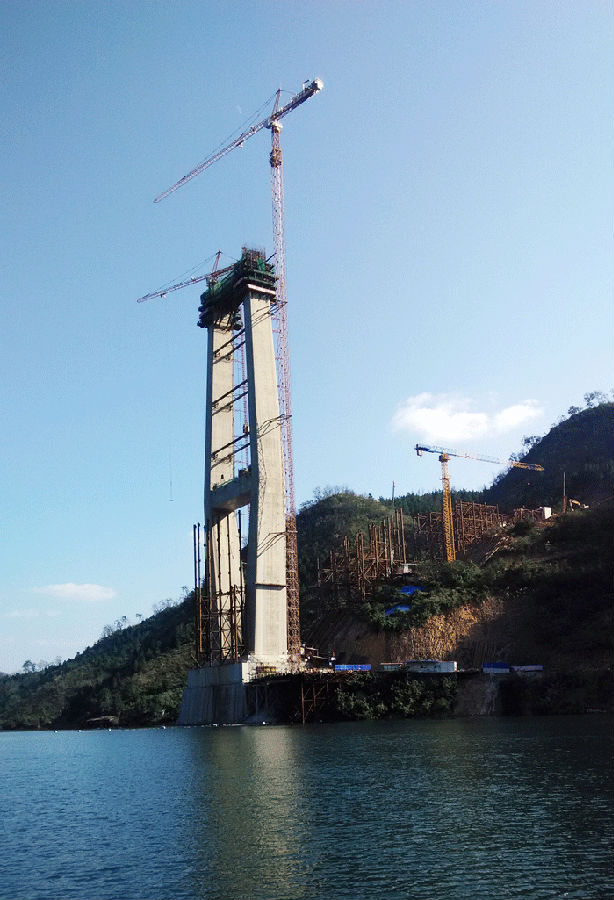 红水河特大桥两侧桥墩高度均为210米,每个桥墩的起重机械配置均为时搏(中国)生产的一台C7036塔机、一台C7030塔机和两台SC200/200WPZ中速变频施工梯,副墩的施工机械为一台P125平头式塔机。