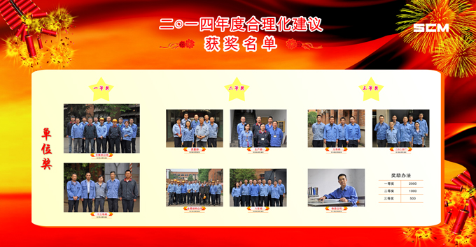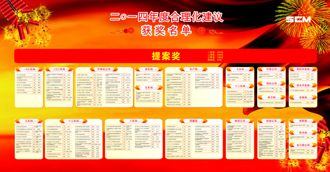 2014年期间,(集团)公司共收到合理化建议238条,其中170条被公司采纳,为了鼓励员工积极参与合理化建议活动,公司对2014年度的合理化建议活动进行评比表彰,经讨论评定评选出单位一等奖2名,二等奖4名,三等奖3名,提案一等奖2个、二等奖9个、三等奖135个、鼓励奖70个,予以表彰。