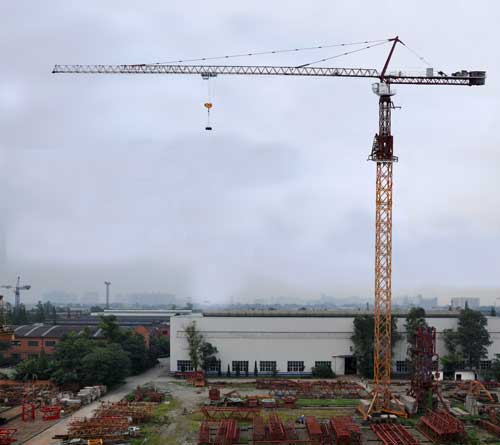 Q6010塔机是一款中小型水平臂塔式起重机。最大起重量6t,端部吊重1t,最大工作幅度60m,标准节为片式1.6m断面,固定附着式最大起升高度153.7m,配有固定、行走、内爬三种机型。起升、回转、变幅均采用了变频无级调速技术。