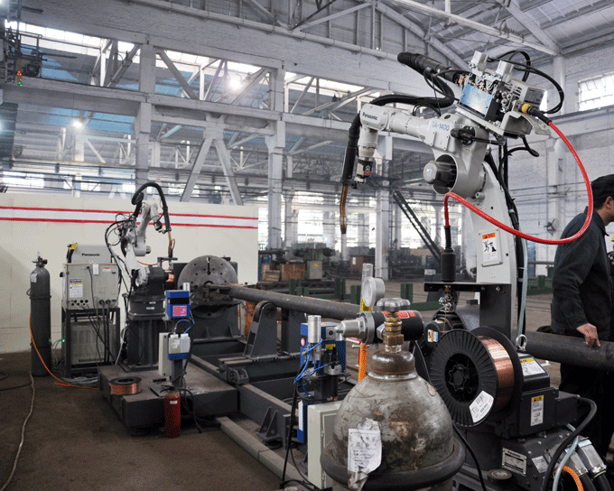 焊接机器人选用进口六轴弧焊接机器人系统,最大伸长范围达1374mm;采用专用工装实现R系列标准节主弦的定位装夹;机器人周边配置清枪、剪丝及喷硅油装置;整个焊接工作站设置一套PLC控制系统,对整个工作站程序控制和动作互锁。