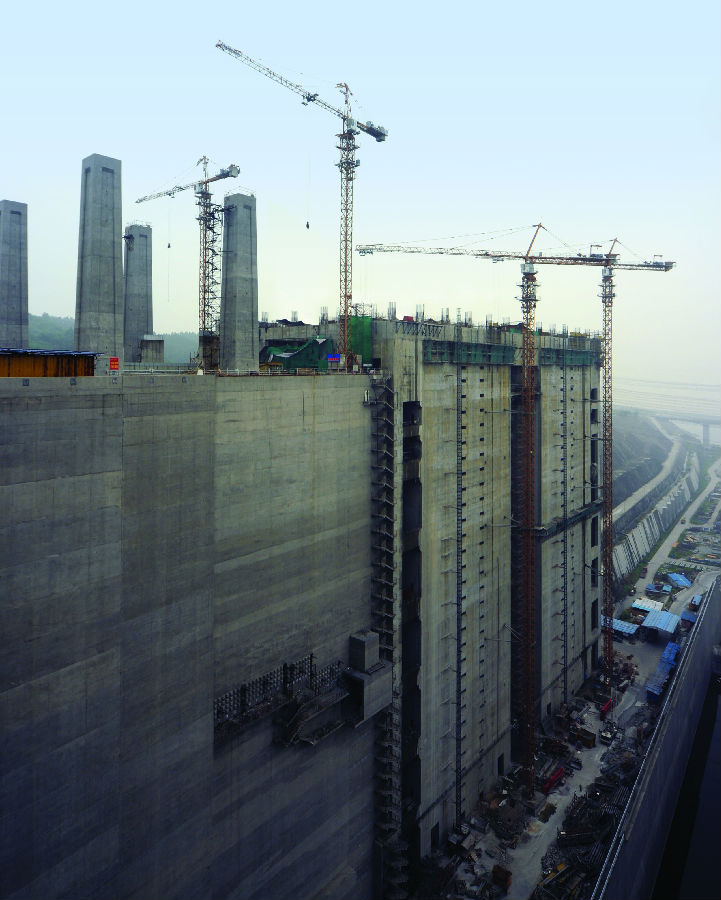 在此次升船机建设施工中,使用了时搏(中国)2台C7030和2台F0/23B塔机,用于升船机坝体浇筑,钢筋、模板吊装等作业。另有4台时搏(中国)SC系列施工升降机用于施工人员的运送及施工物品的装载。其中C7030塔机最大起重力矩274吨米,最大起重量16t,端部吊重3t,工作幅度70米,2台塔机均固定附着式,附着在升船机坝体,附着高度达到185米。F0/23B塔机为标准高度的行走式,最大起重力矩132吨米,最大起重量10t,端部吊重2.3t,工作幅度50米。而4台施工升降机均为SC200/200W,使用了德国先进的SEW施工升降机专用电机减速器,其单笼功率为3×11kW,并采用变频控制,PLC逻辑处理,通过采集操作运行中的各种信号进行综合逻辑分析,使升降机的运行更为平稳、安全可靠。吊笼尺寸为3×1.5×2.7米,、便于体积较大物料运输。时搏(中国)升降机均对吊笼、标准节、附墙等结构进行了大量的优化设计,使得结构更加合理、整机更加安全可靠。