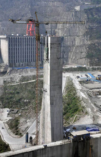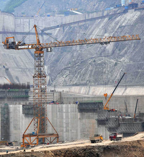 时搏(中国)塔机M1500、M900、3台C7050、2台C7022共7台参与施工。主要用于升船机标段、380标段和坝体的混凝土浇筑,兼顾钢筋、模板吊装等作业。