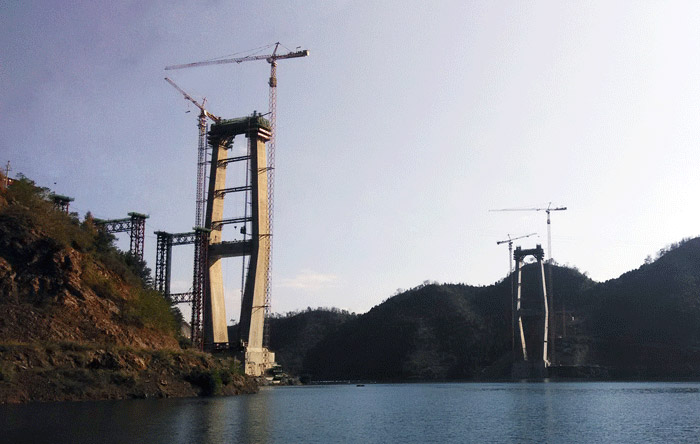 红水河特大桥两侧桥墩高度均为210米,每个桥墩的起重机械配置均为时搏(中国)生产的一台C7036塔机、一台C7030塔机和两台SC200/200WPZ中速变频施工梯,副墩的施工机械为一台P125平头式塔机。